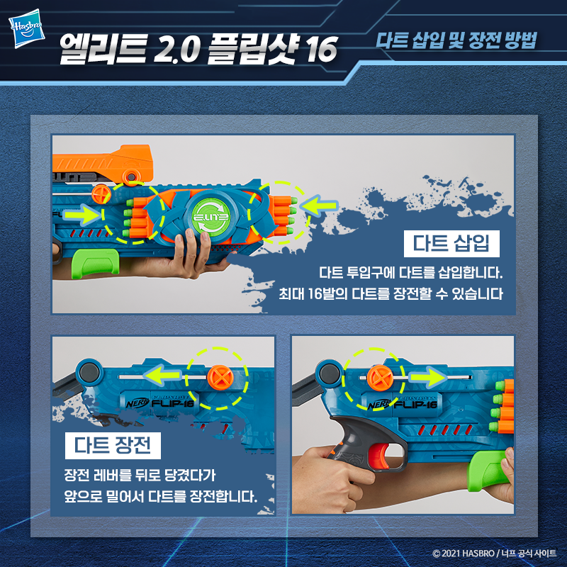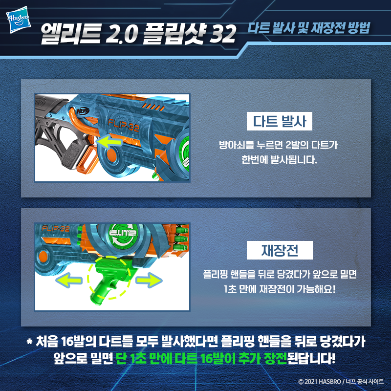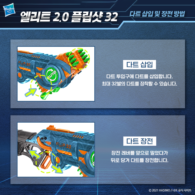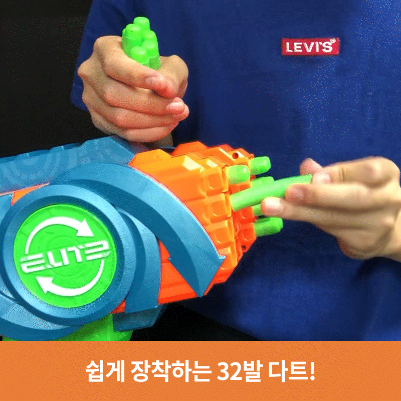 엘리트 2.0 플립샷 32는 엘리트 전용 다트를 최대 32발 장전할 수 있어요!