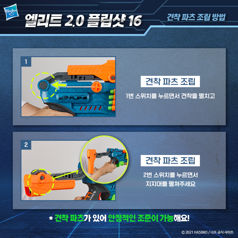 견착 파츠로 안정적인 플립 액션이 가능한 엘리트 2.0 플립샷 16
