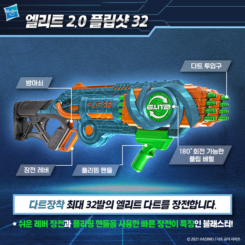 대용량의 다트 장전이 가능한 엘리트 2.0 플립샷 32